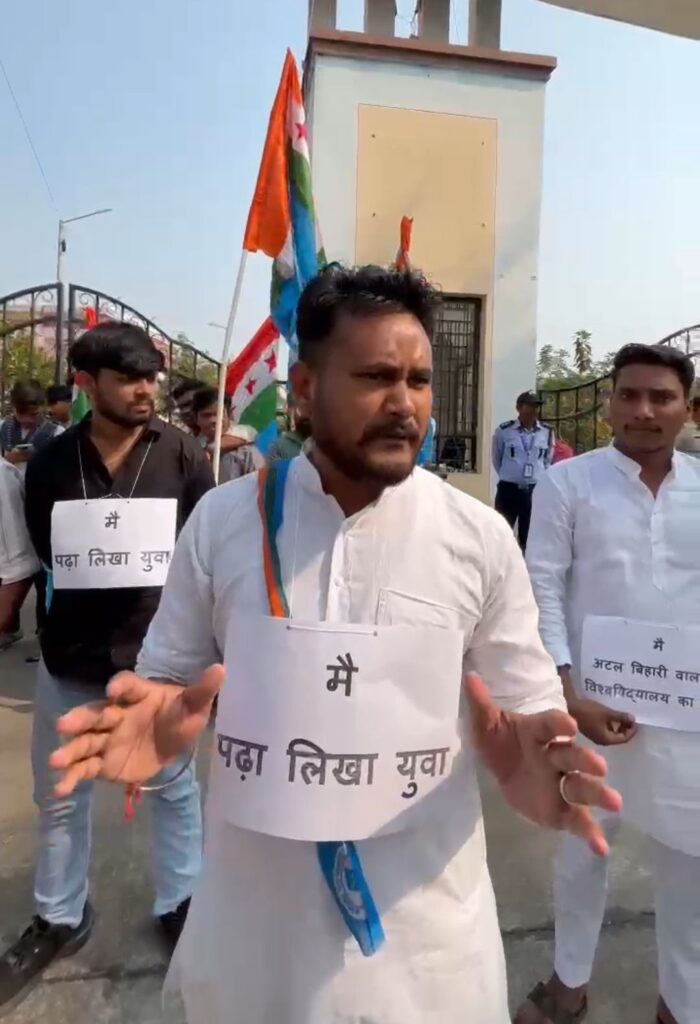 यह विरोध NSUI के प्रदेश सचिव रंजेश सिंह के नेतृत्व में नुक्कड़ सभा और बाजे–गाजे के साथ आयोजित किया गया… जिसका उद्देश्य गूंगी–भैरी बनी यूनिवर्सिटी प्रबंधन और उच्च शिक्षा विभाग को सच का आईना दिखाना था!