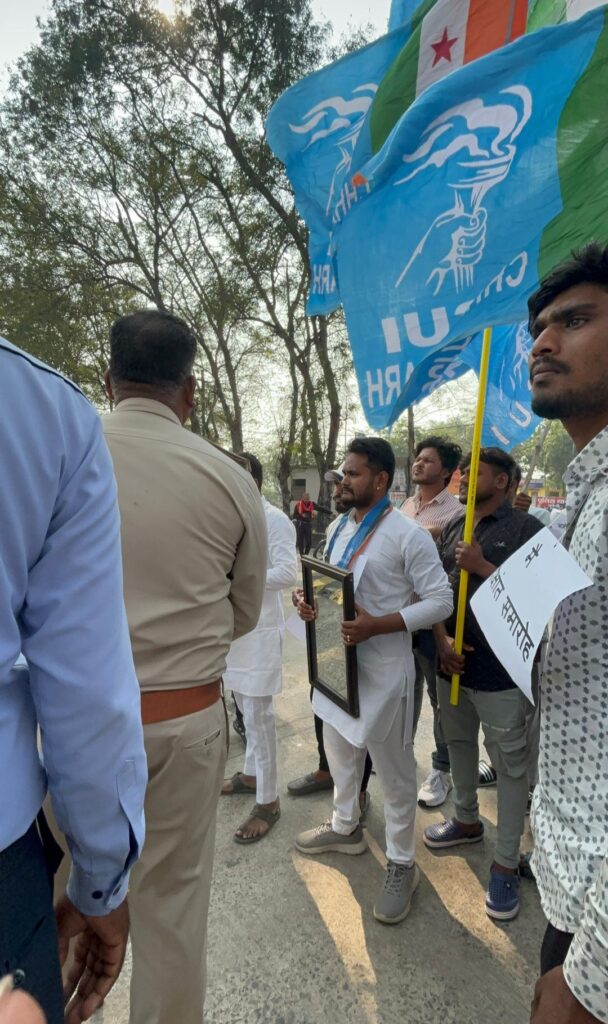 रायपुर_बिलासपुर,,, आज अटल बिहारी वाजपेयी विश्वविद्यालय में व्याप्त अनियमितताओं, छात्रों से हो रहे आर्थिक दोहन और दीक्षांत समारोह जैसी औपचारिकताओं के नाम पर लाखों–करोड़ों रुपये के दुरुपयोग के खिलाफ NSUI ने जोरदार विरोध प्रदर्शन किया!