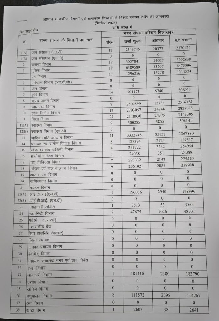 बिलासपुर,,,, छत्तीसगढ़ राज्य विद्युत वितरण कंपनी की माने तो कंपनी के हालात फटेहाल है! केवल बिलासपुर शहर के शासकीय विभागों का बकाया 171 करोड़ है! सबसे बड़े बकायादार में न्यायधानी का नगर निगम सुमार है! जिसका 178 करोड़ का अकेले का बकाया है!