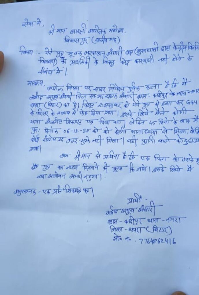 बिलासपुर। सीयू में बिहार से पढ़ने आये होनहार छात्र की लाश ही घर पहुची। उसके मृतकर्म के बाद पिता अरसद अयूब अंसारी रोते बिलखते यूनिवर्सिटी पहुँच उसकी पुस्तको को दान कर दिया जिसे आर्सनल पढ़कर वैज्ञानिक बनना चाहता था, छात्रनेता रंजेश सिंह के साथ एसपी ऑफिस में न्याय की गुहार लगाने पहुँचे उन्होंने कहा की उनके पुत्र की हत्या की गई है, आज 45 दिन हों गए न तो आज तक यूनिवर्सिटी प्रशासन ने कोई संतोषपूर्ण जवाब दिया न पुलिस प्रशाशन ने वे अपने मृतक पुत्र के प्रति न्याय मांगने आये है।