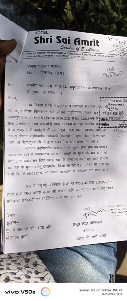बिलासपुर,,,, SDM और थानेदार का तबादला हो गया… कलेक्टर और जिम्मेदार सुन नहीं रहे है! इधर चूचूहियापारा साईं होटल का संचालक पिछले 2 साल से विधानसभा चुनाव के लंबित 150 लाख के बकाया भुगतान के लिए अफसरों के चक्कर काट रहा है! मामला 2023 विधानसभा चुनाव के दौरान PM मोदी की सुरक्षा के लगे SPG कमांडो की टिम को ठहराने और उनके खानपान के बिल का है!