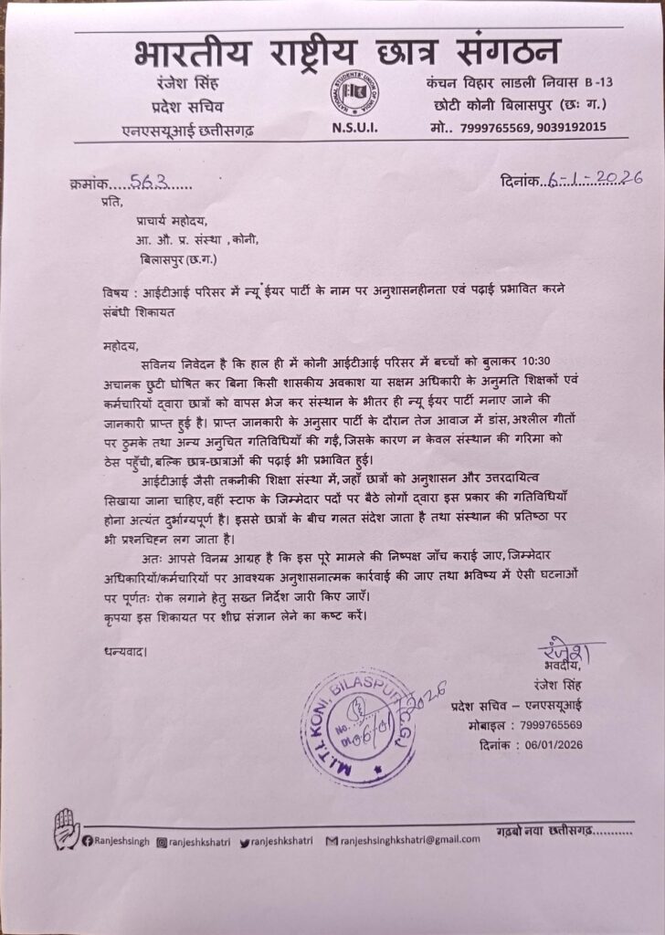 बिलासपुर,,, NSUI और ITI कोनी के छात्रों ने ITI परिसर में नए साल के जश्न के नाम पर हुए कार्यक्रम पर गंभीर आपत्ति जताते हुए प्राचार्य को लिखित शिकायत सौंपी है! शिकायत में कहा गया है! कि 2 जनवरी को कक्षाएं अचानक बंद कर छात्रों को छुट्टी दे दी गई! जबकि उसी दौरान शिक्षकों और कर्मचारियों ने परिसर के भीतर ही न्यू ईयर पार्टी का आयोजन किया!