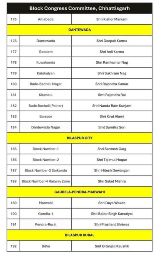 बिलासपुर,,,, छत्तीसगढ़ प्रदेश कांग्रेस कमेटी ने दंतेवाड़ा, बिलासपुर सिटी, बिलासपुर ग्रामीण, और गौरेला पेंड्रा मरवाही के ब्लॉक कांग्रेस कमेटियों का गठन कर दिया है! संतोष गर्ग को बिलासपुर सिटी ब्लॉक नंबर 1 का ब्लॉक अध्यक्ष बनाया गया है! इसी तरह ब्लॉक नंबर 2 ब्लॉक नंबर 3 सरकंडा और ब्लॉक 4 रेलवे जोन एरिया के ब्लॉक अध्यक्ष की घोषणा कर दी गई है!