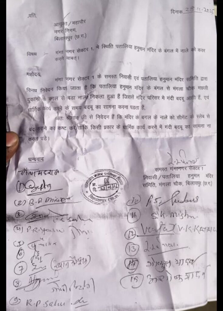 बिलासपुर / मंगला चौक के पास गंगा नगर सेक्टर 1 के रहवासियों ने नगर निगम के आयुक्त और मेयर को ज्ञापन सौंप,सड़क किनारे पतालिया हनुमान मंदिर के आसपास पशु वध और नशेबाजी को बन्द करा नाले को स्लैब लगा कवर करने की मांग की है।