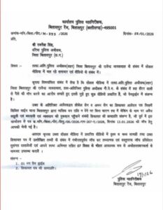 पुलिस महानिरीक्षक बिलासपुर रेंज संजीव शुक्ला ने से 19 जनवरी को जारी आदेश में वरिष्ठ पुलिस अधीक्षक बिलासपुर रजनेश सिंह को