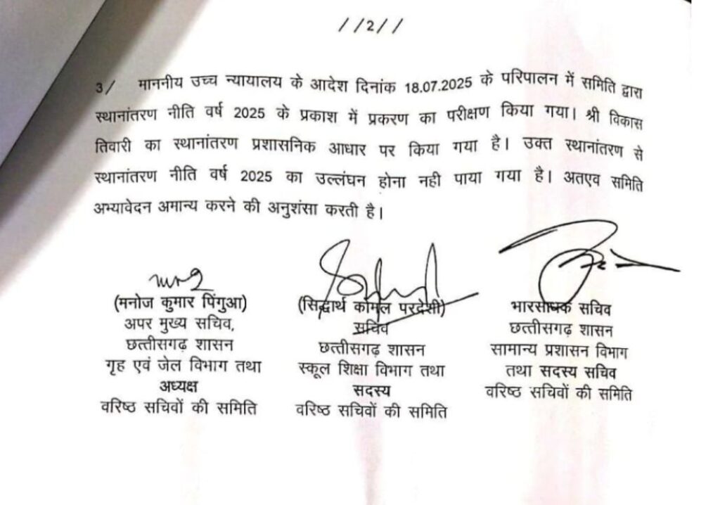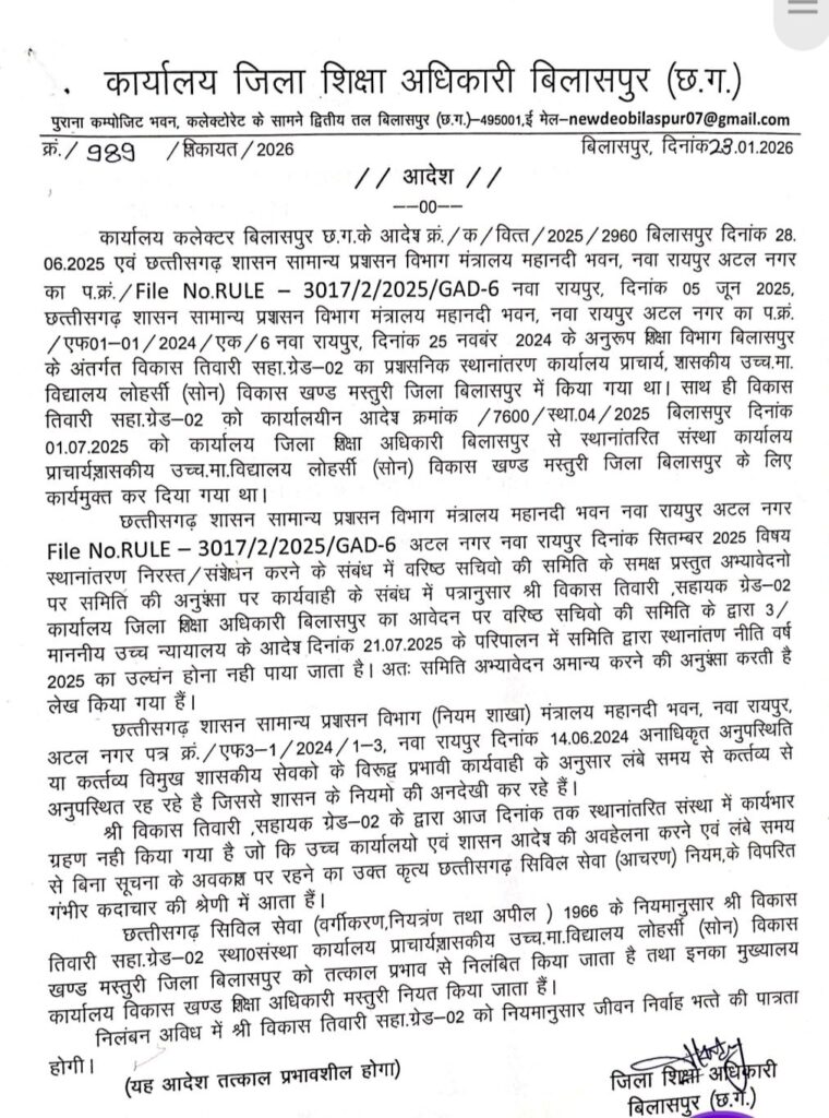 जानकारी के अनुसार कलेक्टर बिलासपुर व छत्तीसगढ़ शासन सामान्य प्रशासन विभाग के निर्देश पर बाबू विकास तिवारी का प्रशासनिक स्थानांतरण जिला शिक्षा अधिकारी कार्यालय से बिलासपुर से मस्तूरी विकासखंड के शासकीय लोहर्सी (सोन) स्कूल में किया गया था। करीब 6 माह पूर्व गत 1 जुलाई 2025 को उन्हें कार्यमुक्त भी कर दिया गया, पर न तो उन्होंने आज तक अपने नए पदस्थापना स्थल पर कार्यभार ग्रहण नहीं किया, औरन ही उन्होंने इसकी सूचना दी। इतना ही नही चर्चित बाबू ने अपना स्थानांतरण निरस्त कराने वरिष्ठ सचिवों की समिति के समक्ष अभ्यावेदन दिया गया था। समिति ने उच्च न्यायालय के 21 जुलाई 2025 के आदेश के अनुपालन में प्रकरण की जांच कर यह स्पष्ट किया कि स्थानांतरण नीति वर्ष 2025 का कोई उल्लंघन नहीं हुआ है और अभ्यावेदन को अमान्य करने की अनुशंसा की गई। इसके बावजूद उन्होंने आदेशों की अवहेलना जारी रखी और लंबे समय तक अनाधिकृत रूप से अनुपस्थित रहे।