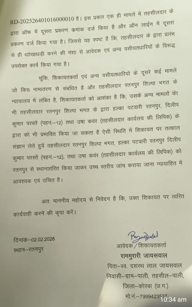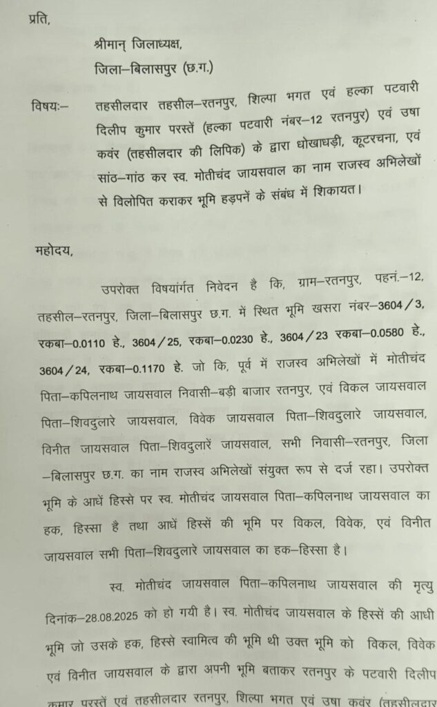 बिलासपुर / रतनपुर निवासी शीतल जायसवाल ने रतनपुर तहसीलदार शिल्पा भगत, पटवारी दिलीप परस्ते और लिपिक उषा कंवर के खिलाफ सांठगांठ कर पक्षपातपूर्ण कार्रवाई और पेशी दिनांक के पहले एकपक्षीय आदेश करने का आरोप लगाते हुए इसकी शिकायत कलेक्टर से की है।