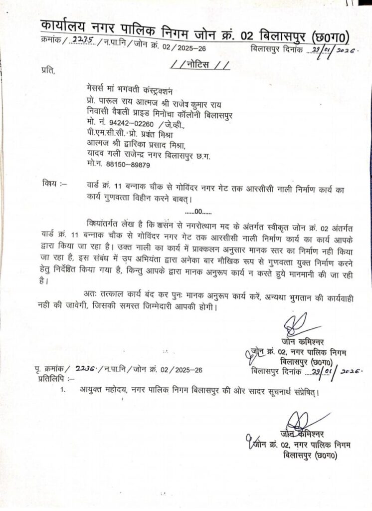 बिलासपुर,,, नगर पालिक निगम बिलासपुर जोन क्रमांक 02 के वार्ड क्रमांक 11 में कराए जा रहे आरसीसी नाली निर्माण कार्य में गंभीर अनियमितताएं पाए जाने पर ठेकेदार को कड़ी चेतावनी जारी की है.. यह नोटिस बनाक चौक से गोविंद नगर गेट तक चल रहे नाली निर्माण कार्य को लेकर जारी किया गया है.. जोन कार्यालय द्वारा जारी नोटिस में उल्लेख किया गया है कि, शासन द्वारा नगरोत्थान मद के अंतर्गत स्वीकृत उक्त नाली निर्माण कार्य निर्धारित मानकों के अनुरूप नहीं किया जा रहा है..