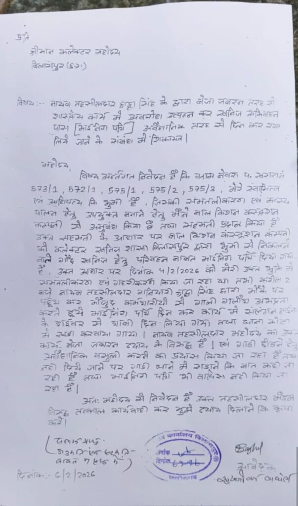 कलेक्टर संजय अग्रवाल को की गई शिकायत में सोहन लाल ने नायब तहसीलदार पर आरोप लगाया कि ग्राम नेवरा की 673/1 572/1 575/1 और 575/3 उसकें सवामित्व और अधिपत्य की भूमि है! जिसके समतलीकारण और मत्स्य पालन के लिए उन्होंने बाल किशन कंट्रक्शन कंपनी से अनुबंध किया है! इसी अनुबंध के तहत उनके द्वारा संबंधित भूमि के गहरीकरण और समतलीकारण का कार्य कराया जा रहा था! तभी नायाब तहसीलदार द्वारा गाली गलौज अभद्रता करते हुए हाईवा के ड्राइवर से चाबी छीना गया…. और गाड़ी को थाने में सड़ाने की धमकी दी गई… सोहन लाल और उप सरपंच भवानी शंकर इसकी शिकायत लेकर कलेक्ट्रेट पहुंचे… नायाब तहसीलदार श्रद्धा सिंह का कहना है! कि एक तो हाईवा में नंबर नहीं था!
