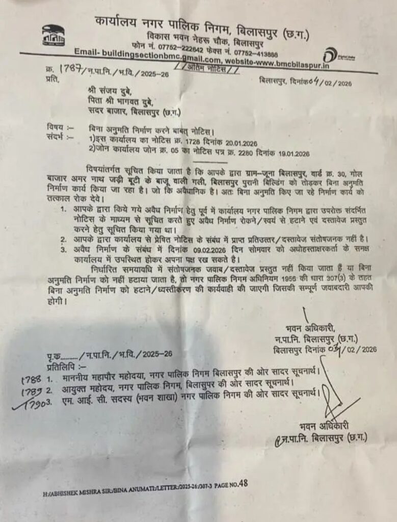 गोल बाजार के अवैध निर्माण मामले में संजय दुबे को नोटिस लेकर सोशल मीडिया में जमकर चर्चा है। पब्लिक पूछ रही कि गरीबो के झोपड़े को बुलडोजर चलवा ढहाने वाले निगम प्रशासन के हाथ बड़े लोगो का नाम आने पर क्यो कांपने लगते है, आखिर उन्हें किस नेता का संरक्षण है। बिना नक्शा के बन रही अवैधानिक बिल्डिंग पर प्रशासन का बुलडोजर क्यों नहीं चल रहा आखिर कौन संरक्षण दे रहा।