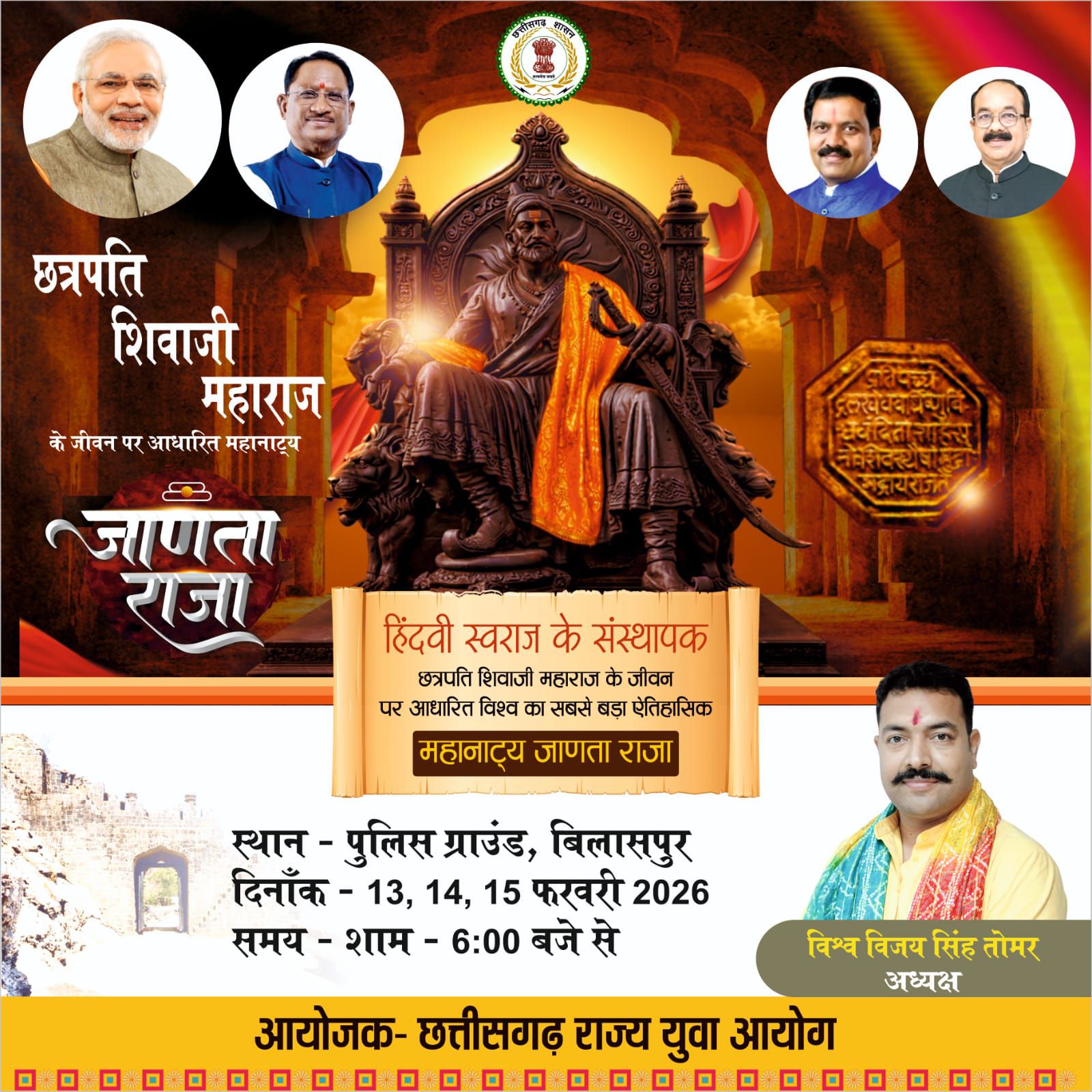 ल्कि भारत के आत्मगौरव, स्वाभिमान और साहस के जीवंत प्रतीक हैं। स्वराज के संस्थापक शिवाजी महाराज के अद्वितीय जीवन, संघर्ष और जनकल्याण की भावना को सजीव रूप में प्रस्तुत करने वाला विश्वप्रसिद्ध ऐतिहासिक महानाट्य “जाणता राजा” बिलासपुर की धरती पर 13 से 15 फरवरी तक मंचित होने जा रहा है।