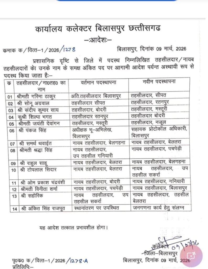बिलासपुर । कलेक्टर संजय अग्रवाल ने तहसीलदार और नायब तहसीलदारों का ट्रांसफर आदेश जारी किया है। इस इधर- उधर से जिले के 14 अधिकारी प्रभावित हुए है।