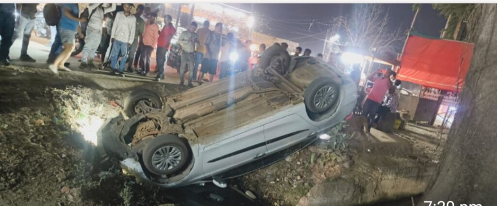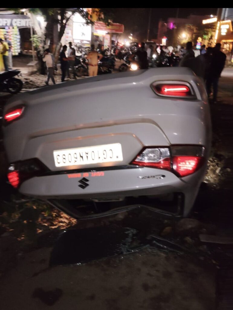 बिलासपुर / मोपका चौक पर शुक्रवार रात तब अफरा- तफरी मच गई जब निगम के विवादित काम्प्लेक्स के ठीक सामने खतरनाक नाले में कार अनियंत्रित होकर पलट गई। कार के चारो चक्के ऊपर हो गए। मौके पर मौजूद युवाओं ने शीशा तोड़कर चालक को किसी तरह बाहर निकाल उसकी जान बचाई।