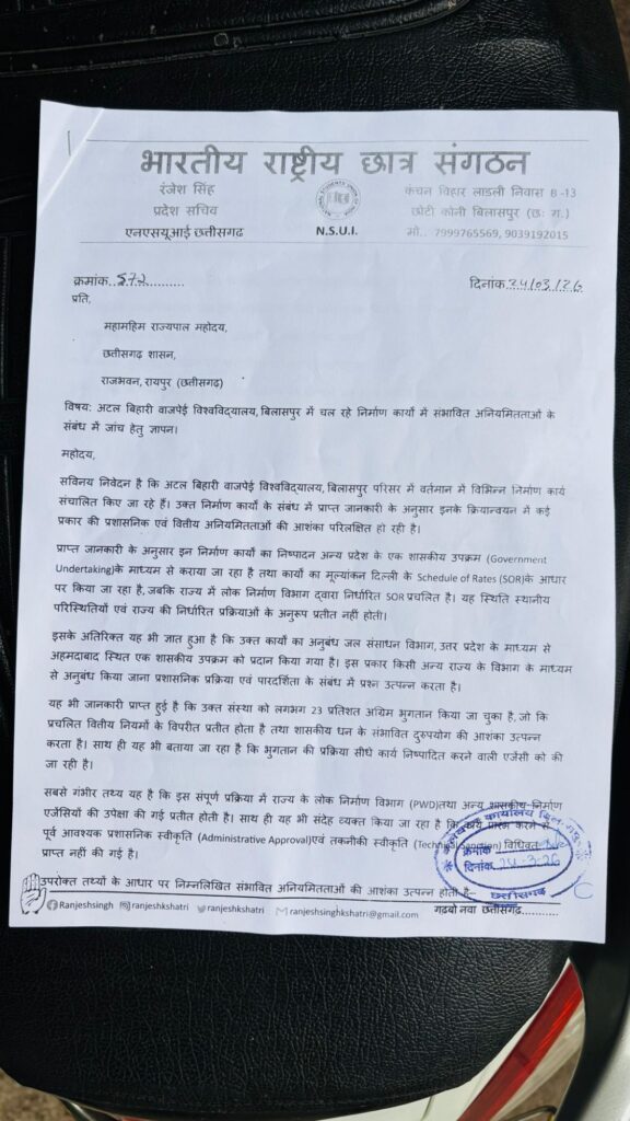 बिलासपुर,,, अटल बिहारी वाजपेई विश्वविद्यालय, बिलासपुर में संचालित निर्माण कार्यों को लेकर गंभीर अनियमितताओं की आशंका जताई गई है! इस संबंध में NSUI के प्रदेश सचिव रंजेश सिंह ने महामहिम राज्यपाल के नाम रजनी भगत डिप्टी कलेक्टर को ज्ञापन सौंपकर पूरे प्रकरण की निष्पक्ष एवं उच्च स्तरीय जांच की मांग की है!