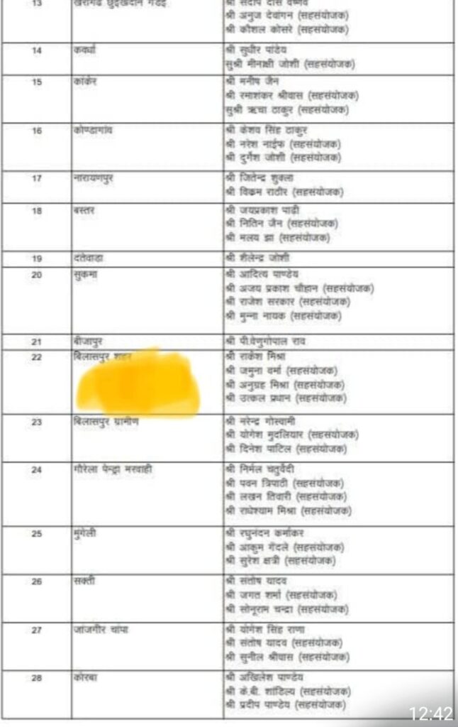 बिलासपुर / भारतीय जनता पार्टी के प्रदेश अध्यक्ष किरण सिंह देव की सहमति से भारतीय जनता पार्टी विधि प्रकोष्ठ छत्तीसगढ़ की जिला संयोजक एवं सहसंयोजक की घोषणा की गयी, बिलासपुर जिला से अधिवक्ता राकेश कुमार मिश्रा को बिलासपुर जिले का शहरी जिला संयोजक नियुक्त किया गया है श्री मिश्रा पूर्व में भी जिला संयोजक के रूप में कार्य करते रहे संगठन ने उन्हें इस बार भी दायित्व प्रदान किया गया हैं…