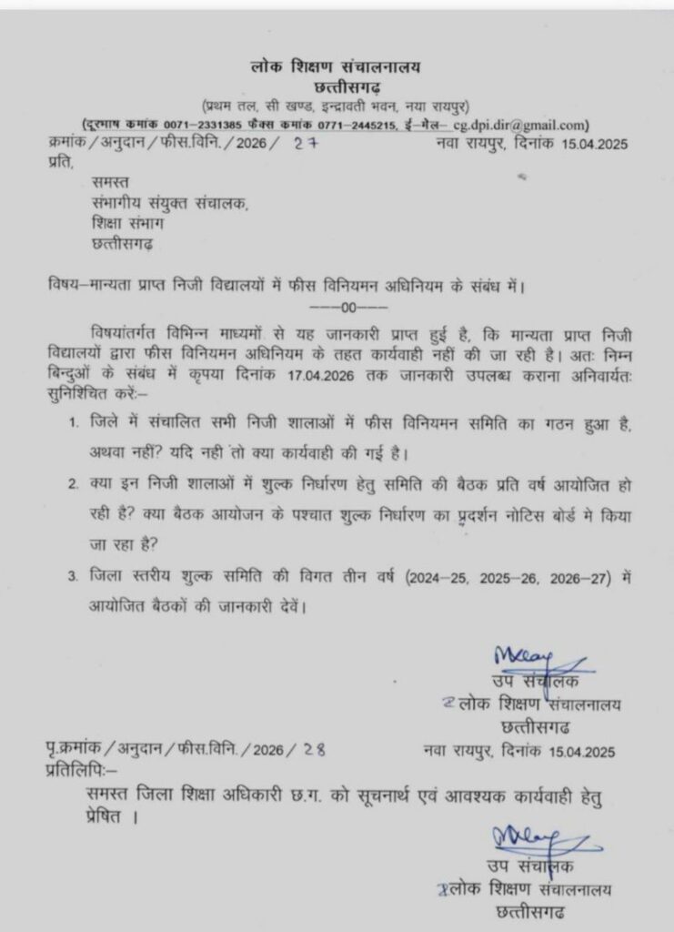 जारी आदेश में साफ कहा गया है कि सभी निजी स्कूलों में फीस विनियमन समिति का गठन होना चाहिए और उसकी जानकारी उपलब्ध कराई जाए। साथ ही, शुल्क निर्धारण के लिए समिति की नियमित बैठकें आयोजित हों और तय फीस को स्कूल के नोटिस बोर्ड पर सार्वजनिक रूप से प्रदर्शित किया जाए। इसके अलावा पिछले तीन शैक्षणिक सत्रों (2024-25, 2025-26, 2026-27) में जिला स्तरीय शुल्क समिति की बैठकों का पूरा विवरण भी मांगा गया है।