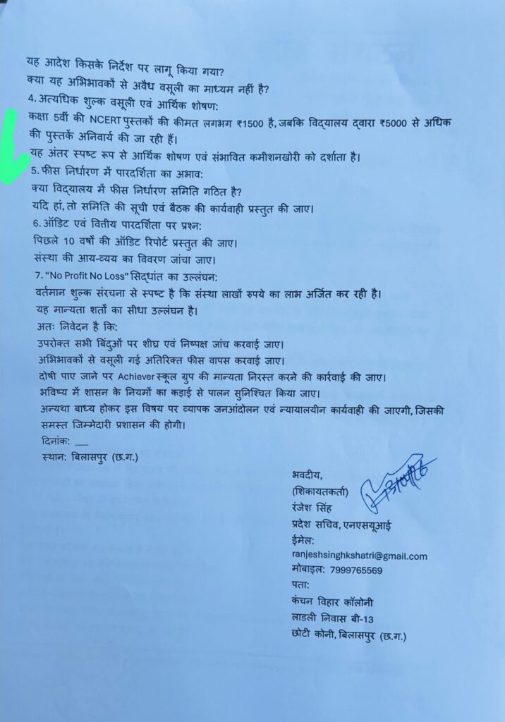बिलासपुर,,,, निजी स्कूलों द्वारा मनमानी फीस वसूली के खिलाफ उठी आवाज का असर अब साफ दिखने लगा है। एनएसयूआई के प्रदेश सचिव रंजेश सिंह द्वारा जिला शिक्षा अधिकारी को सौंपे गए ज्ञापन और किए गए प्रदर्शन के बाद प्रशासन ने मामले को गंभीरता से लिया है। लोक शिक्षण संचालनालय, छत्तीसगढ़ द्वारा जारी ताजा आदेश में सभी संबंधित अधिकारियों को निजी विद्यालयों में फीस विनियमन अधिनियम के पालन की स्थिति पर जल्द रिपोर्ट प्रस्तुत करने के निर्देश दिए गए हैं।