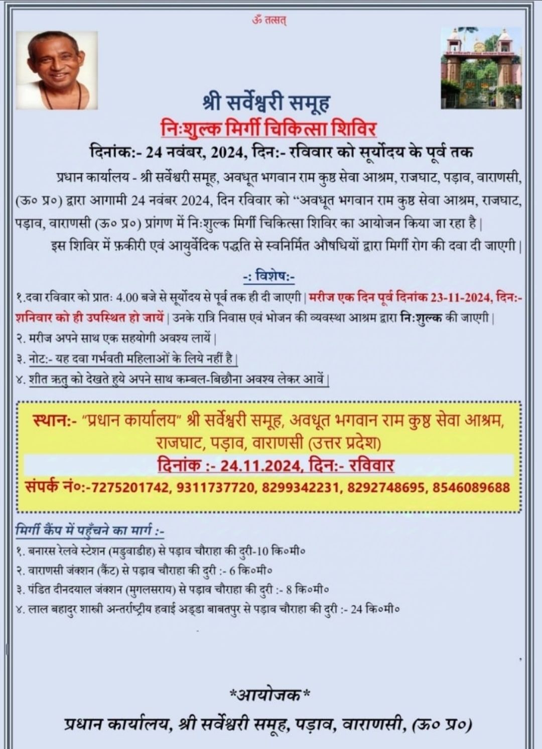 बिलासपुर। श्री सर्वेश्वरी समूह अवधूत भगवान कुष्ठ सेवा आश्रम द्वारा उत्तरप्रदेश राजघाट पड़ाव वाराणसी मुख्यालय के आश्रम प्रांगण में आगामी 24 नवम्बर को निःशुल्क मिर्गी चिकित्सा शिविर का आयोजन किया जा रहा है।