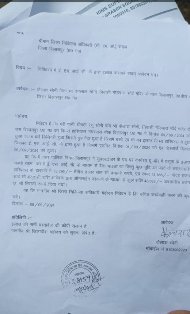 गोड़पारा के निगम के टास्क कर्मी कैलाश सोनी ने अपनी गर्भवती पत्नी रेणु सोनी को प्रसूती के लिए मगरपारा के किम्स अस्पताल में इस शर्त पर भर्ती कराया कि उसके पास पैसे नही है क्या esic कार्ड से उसकी पत्नी का उपचार हो जाएगा ।