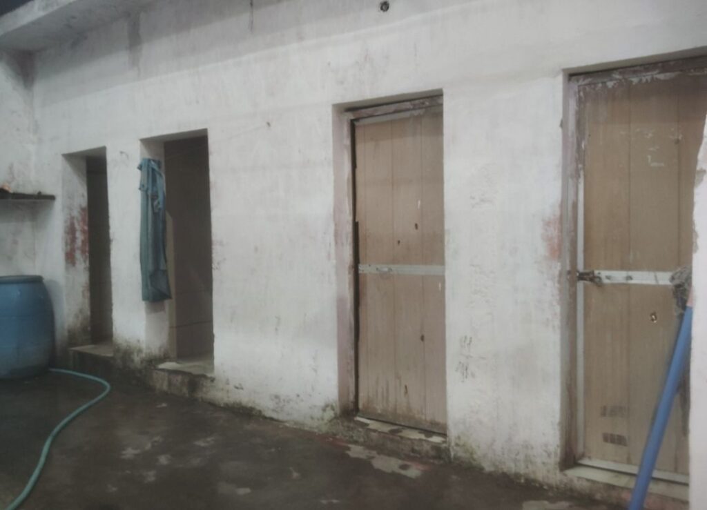 0 4 बाथरूम में से दो में लटक रहा ताला 2 में दरवाजा नही पर्दा लगाकर चला रहे काम