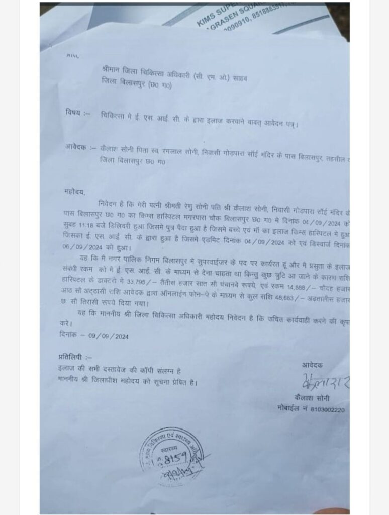 गोड़पारा निवासी निगम के टॉस्क कर्मी कैलाश सोनी ने किम्स प्रबंधन से ईएसआईसी चलेगा यह कन्फर्म करने के बाद अपनी पत्नी रेणु को डिलीवरी के लिए हॉस्पिटल में भर्ती कराया। गत 4 सितम्बर को ऑपरेशन से बेटे का जन्म हुआ। 2 दिन बाद गत 6 सितम्बर को प्रसूता को बुखार आने के बावजूद यह कहकर डिस्चार्ज कर ईएसआईसी कार्ड एक्सेप्ट न होने की बात कह पैसा जमा करने दबाव बनाया गया तब कैलाश ने आयुष्मान कार्ड भी प्रस्तुत किया पर उसे नकद जमा करने दुर्व्यवहार कर इतना दबाव बनाया गया कि कैलाश को अपने पत्नी के 3 मंगलसूत्र गिरवी रख अस्पताल में रकम जमा करना पड़ा। कैलाश ने जब कहा कि रेणु तो बुखार से तप रही तब उससे कहा गया कि आगे इलाज कराना है तो काउंटर से फिर पेमेंट कर रसीद कटाकर आइये तब आगे इलाज होगा।