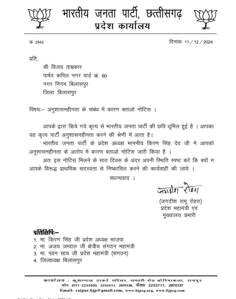 बिलासपुर। विपक्ष और जनता तो दूर सुशासन के दावे वाली सरकार के कामकाज से बिलासपुर के भाजपा पार्षद विजय ताम्रकार तक खुश नही है। हाल ही में उन्होंने डिप्टी सीएम अरुण साव पर विकास कार्यों के लिए राशि नहीं देने का आरोप क्या लगाया भाजपा के प्रदेश महामंत्री ने उन्हें प्राथमिक सदस्यता समाप्त करने की चेतावनी दे नोटिस जारी कर 7 दिनों में जवाब मांगा है।