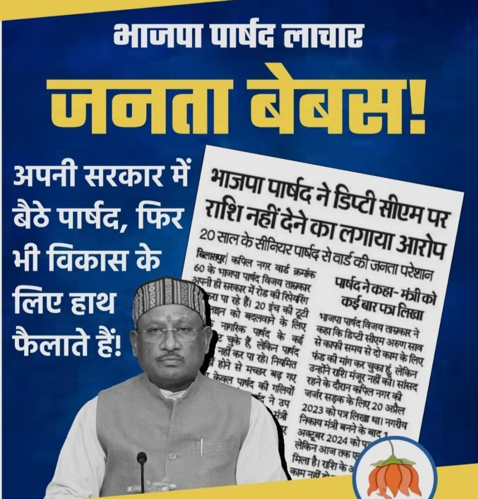 अरपापार के भाजपा पार्षद विजय ने गत दिनों डिप्टी सीएम पर सार्वजनिक रूप से यह आरोप लगाया कि उनके वार्ड के विकास कार्यों के लिए कोई राशि प्रदान नहीं की जा रही है। इस बयान को पार्टी के अनुशासन और नीतियों के खिलाफ माना गया। भाजपा प्रदेश नेतृत्व ने इसे गंभीरता से लेते हुए उन्हें कारण बताओ नोटिस जारी किया है।