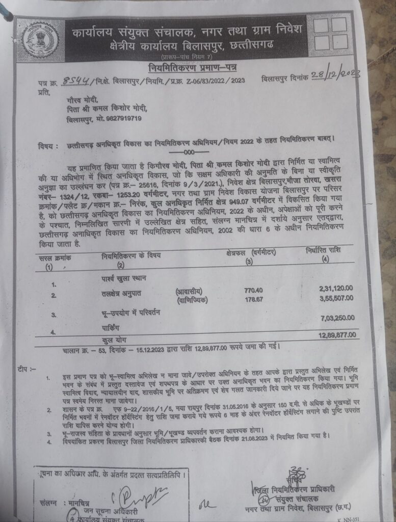 टीएनसी और निगम के चर्चित अफसर को जरा भी भय नही। आप खुद देखिए कैसे बेखौफ होकर खेल खेला गया कि सरकार तो रिपीट हो रही बना लेंगे, पर सत्ता परिवर्तन हो गया। 13 दिसम्बर 2023 को सुशासन के दावे वाले विष्णुदेव साय ने शपथ लेकर मुख्यमंत्री पड़ के8 कमान संभाली और इसके महज 15 दिन बाद तोरवा के उस चर्चित अभी तक निर्माणाधीन भवन के मालिक को 28 दिसम्बर 2024 को नियमितीकरण का सर्टिफिकेट तक जारी कर दिया गया।
