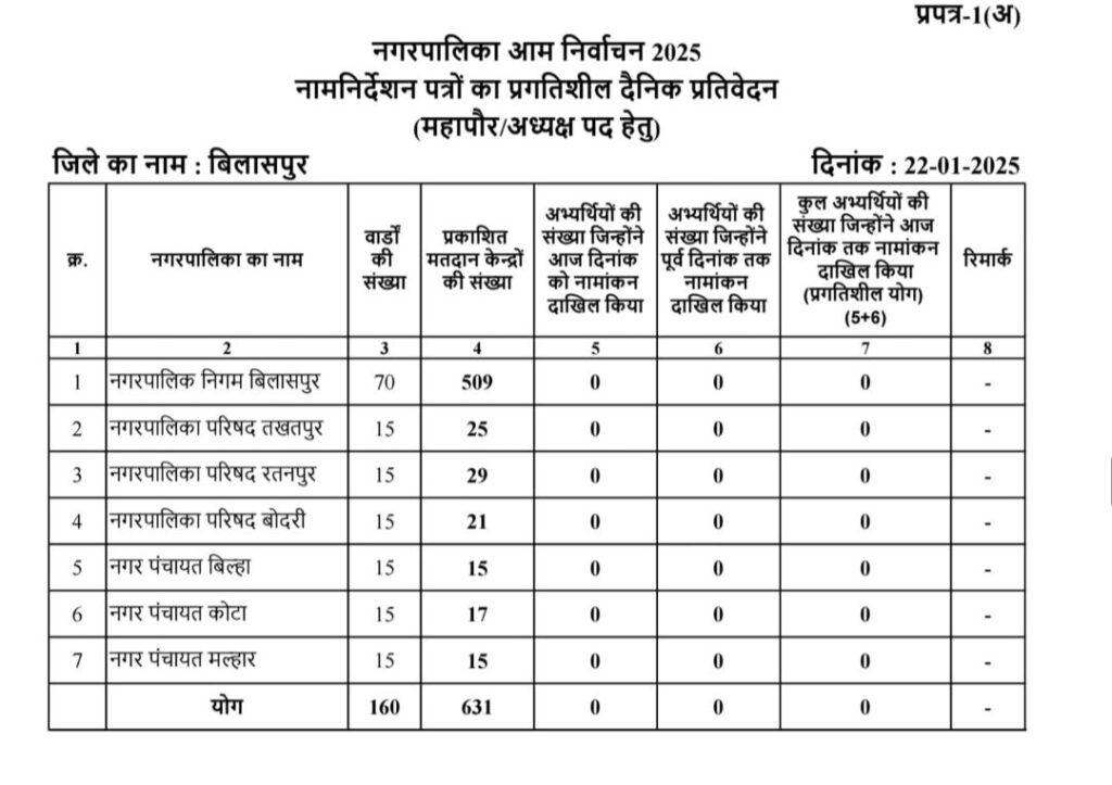 बिलासपुर। नामांकन प्रक्रिया के पहले दिन बिलासपुर नगर निगम के पार्षद पद की दावेदारी कर रहे अलग- अलग रणनीतिक दलों के 29 उम्मीदवारों नामांकन पत्र खरीदे। मेयर पद और नामांकन पत्र दाखिल करने का स्टेटस जीरो रहा।