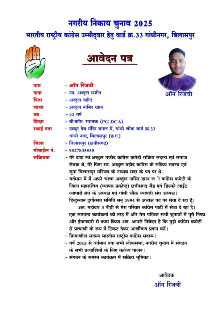 बिलासपुर। शहर के वार्ड नम्बर 33 गांधी नगर से कांग्रेस से पार्षद पद हेतु ऑन रिजवी ने दावेदारी ठोक दी है।