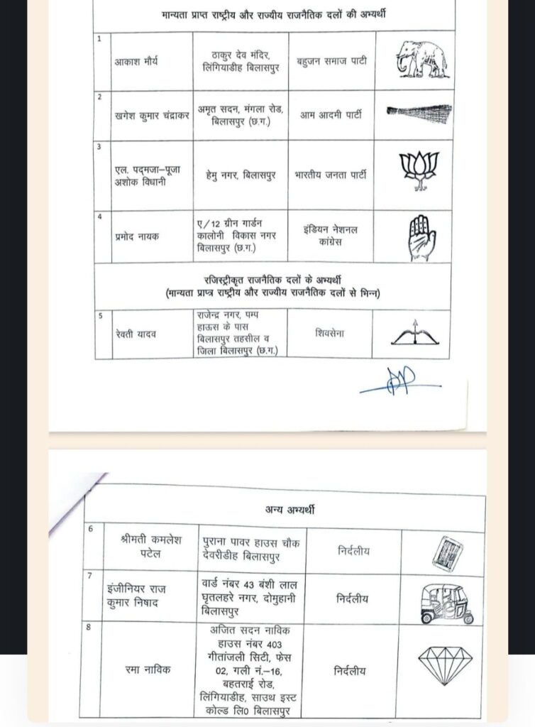 बिलासपुर। निगम चुनाव के लिए नाम वापसी के अंतिम दिन जहाँ पार्षद पड़ के 9 दावेदारों ने अपना नामांकन पर वापस लेकर मैदान छोड़ दिया । वही महापौर पद के 2 दावेदारों ने। अब 70 वार्डो में जहां 263 पार्षद पड़ के प्रत्याशी मविदान में है वही मेयर पद के 8। कही राष्ट्रीय दलों के बीच सीधी टक्कर है तो कही त्रिकोणीय तो कही 4-4, 5-5 प्रत्याशी मुकाबले में है।