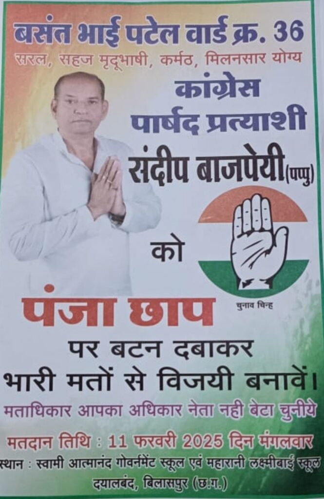 बिलासपुर वार्ड क्रमांक 36 बसंत भाई पटेल नगर से कांग्रेस से पार्षद पद के दावेदार संदीप बाजपेई ने कहा, कि 9 हजार मतदाताओं वाला यह वार्ड मेरा घर मेरा परिवार है! मै इनसे सीधे तौर पर जुड़ा हूँ और यहाँ की समस्याओ को दूर करने भरसक प्रयास करूंगा!