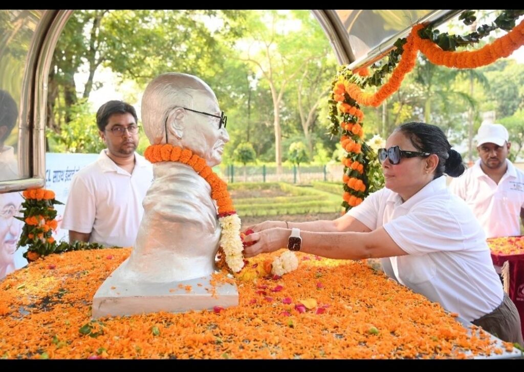 रन के समापन के बाद एसईसीएल नेहरू शताब्दी नगर के गांधी उद्यान में राष्ट्रपिता महात्मा गाँधी की 155 वीं जयंती पर एसईसीएल परिवार की प्रथम महिला एवं श्रद्धा महिला मण्डल अध्यक्षा पूनम मिश्रा, एवं एसईसीएल निदेशक मण्डल एवं सीवीओ, श्रमसंघ प्रतिनिधियों, विभागाध्यक्षों, अधिकारी-कर्मचारियों द्वारा गांधी जी की प्रतिमा पर फूलमाला, पुष्प अर्पित कर अपनी आदरांजली अर्पित की गई।