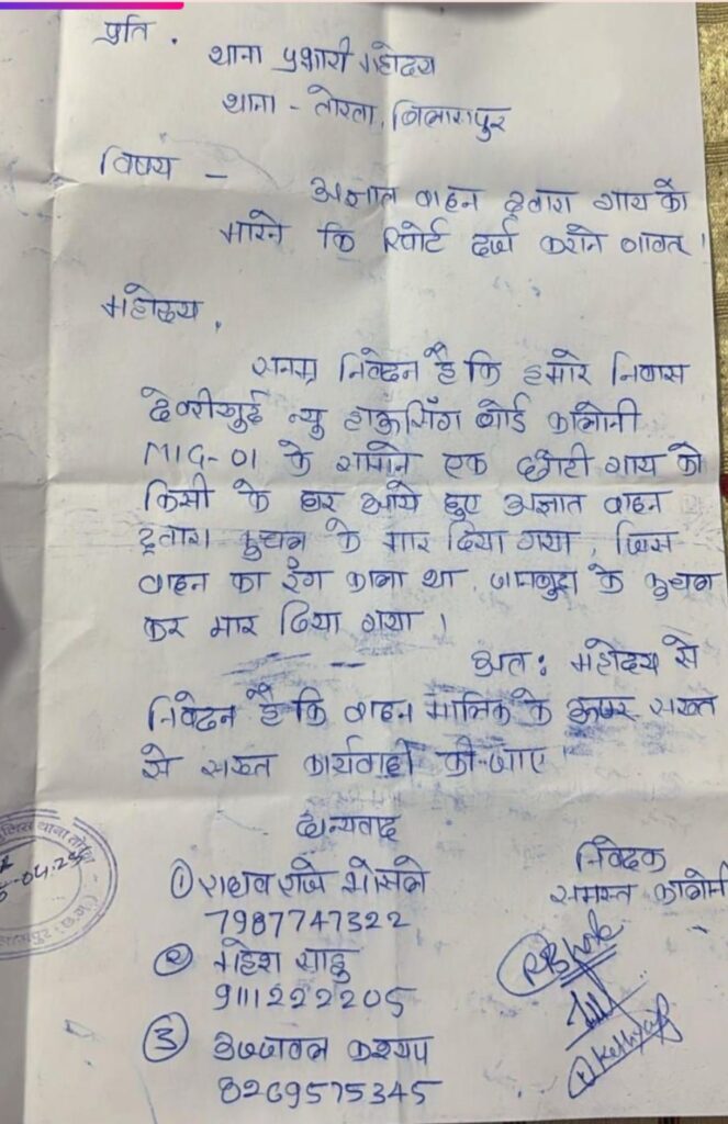 बिलासपुर । हाईकोर्ट की फटकार के बाद भी मवेशियों के उचित प्रबंधन न करने के कारण सड़क पर बैठे गोवंश को कैसे आये दिन बेरहमी पूर्वक कुचलकर मारा जा रहा, देवरीखुर्द से आई ये तस्वीर इसकी बानगी है।