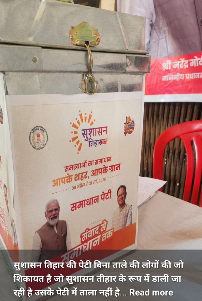 00 वही बिलासपुर में आरोप है कि सुशासन तिहार को गम्भीरता से नही लिया गया, पेटी पर ताला ही नही था जिससे गोपनीयता को लेकर सवाल उठे।