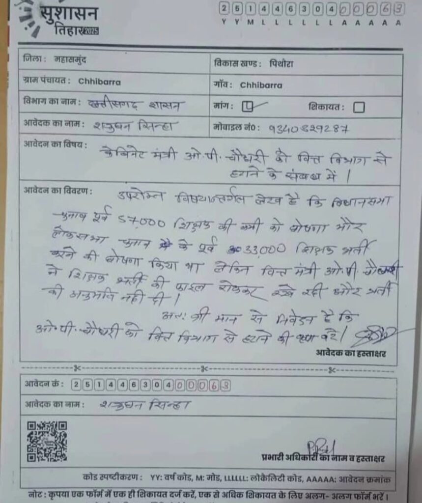 00 इधर महासमुंद जिले के पिथौरा ब्लॉक के शत्रुघ्न सिन्हा ने छत्तीसगढ़ शासन के नाम शिकायत कर वित्त मंत्री ओपी चौधरी को वित्त विभाग से हटाने आवेदन दिया है। उनकी नाराजगी उनका आरोप ये है कि श्री चौधरी ने लोकसभा चुनाव पूर्व 57000 और विधानसभा चुनाव पूर्व 33000 शिक्षको की भर्ती की घोषणा तो कर दी, लेकिन सरकार बनने के बाद इसे लटका दिया।