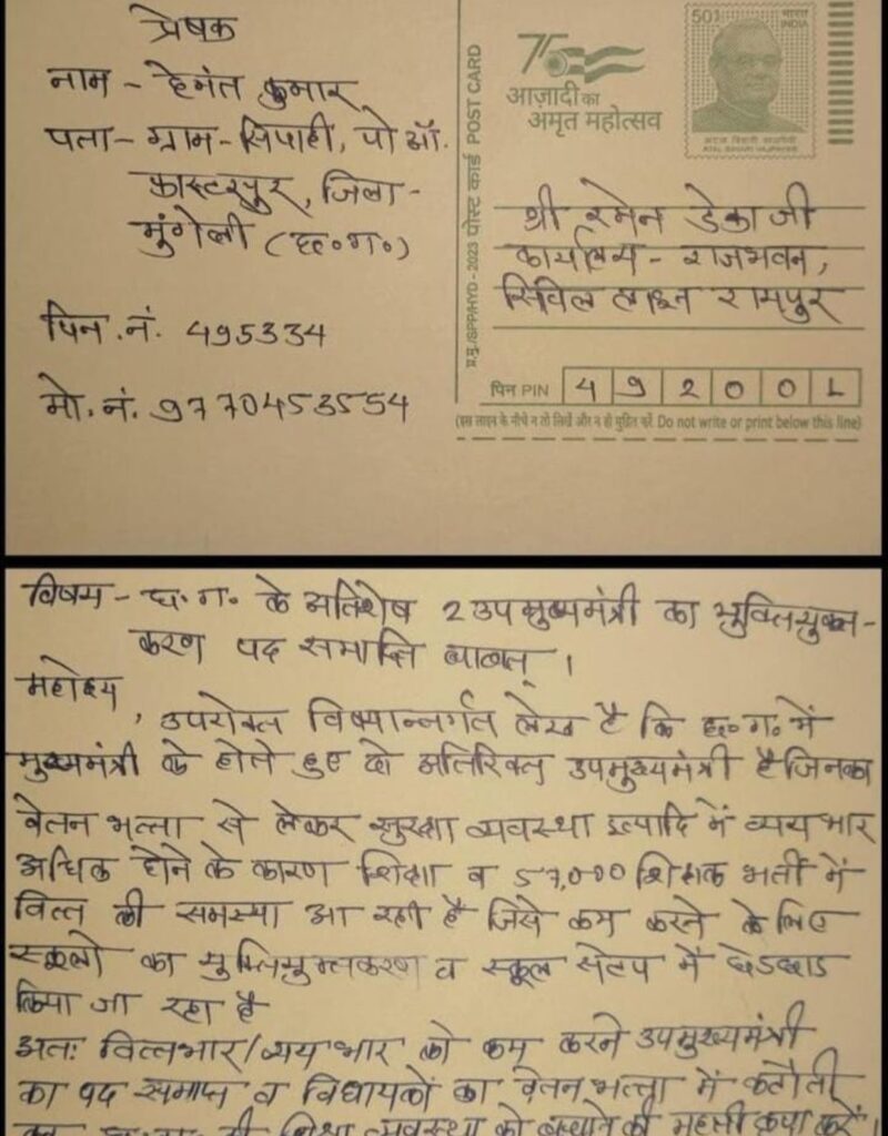 राजभवन के पते पर राज्यपाल रमेन डेका को भेजा गया पोस्टकार्ड जमकर वायरल हो रहा है। हेमंत ने राज्यपाल को भेजे गए पत्र में कहा है कि छत्तीसगढ़ में मुख्यमंत्री के होते हुए दो अतिरिक्त उपमुख्यमंत्री है जिनके वेतन, भत्ते से लेकर सुख्ता व्यवस्था इत्यादि में व्ययभार अधिक होने के कारण शिक्षा व 57,000 शिक्षक भर्ती में वित्त की समस्या आ रही है जिसे कम करने के लिए स्कूलो का युक्तियुक्तकरण कर स्कूलों को बंद नही पड़ोस के स्कूल में समायोजित करने की बात कही जा रही तो ये क्यो नही। उन्होंने सरकार के वित्तीय भार/व्ययभार को कम करने उपमुख्यमंत्रियों के वेतन भत्ता में कटौती कर इन पदों को समाप्त कर शिक्षा व्यवस्था को बचाने की मांग की है, की जब 1 मुख्यमंत्री है तो फिर 2 उपमुख्यमंत्री और उनके वेतन भत्ते पर इतना खर्च क्यो।