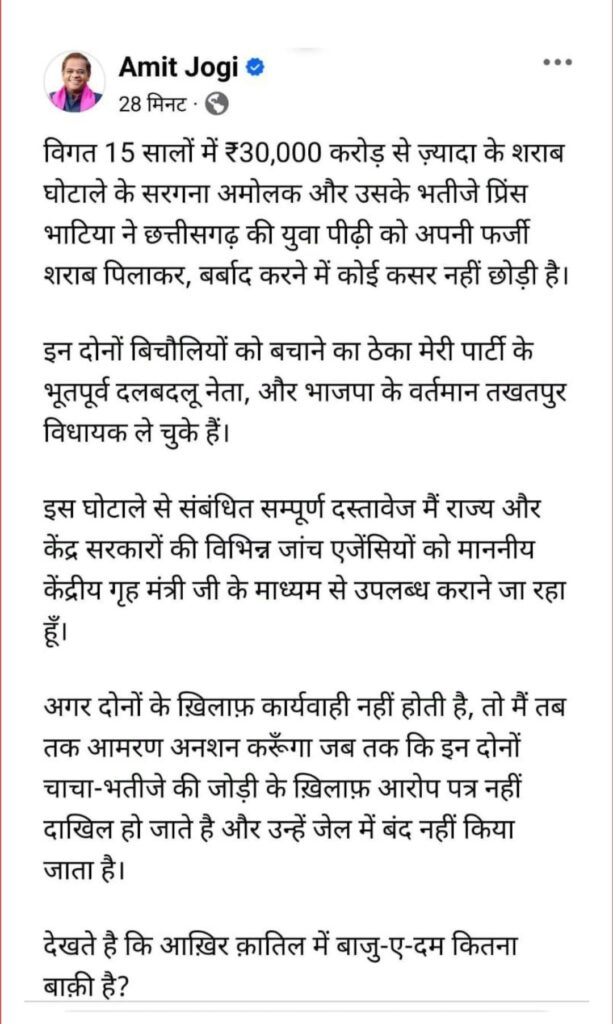 अमित जोगी ने दो दिन पहले ही अपने सोशल मीडिया पोस्ट में प्रदेश में पिछले कुछ सालों में का करोड़ो के शराब घोटाले का दावा करते हुए शराब कारोबारी रहे अमोलक सिंह भाटिया और प्रिंस भाटिया प्रदेश के युवा पीढ़ी को नशे के गर्त में धकेलने आरोप लगा बड़े आंदोलन का संकेत दे छत्तीसगढ़ की राजनीति के माहौल को सुलगा दिया।