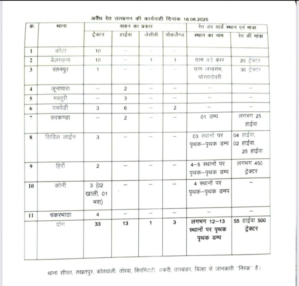 बिलासपुर कलेक्टर संजय अग्रवाल और एसएसपी रजनेश सिंह ने सोमवार को जिले के एसडीएम , एसडीओपी , सीएसपी , तहसीलदार , नायब तहसीलदारी, थाना प्रभारी, खनिज विभाग के अधिकारी, कार्यपालिक अधिकारियों की 60 से 70 अलग-अलग टीमें बनाकर 80-85 घाटों पर छापेमार कार्यवाही की जिससे भागमभाग मचा रहा, नेताओ के पिछलग्गुओं को भी मौके से भागना पड़ा, वे अपने आकाओं का मोबाइल घनघनाते रहे, कुछ नेताओं ने रेड मारने वाले अफसरों को कॉल भी किया कि ये सब चल कया रहा अफसरों ने भी हाथ खडे कर दिए।