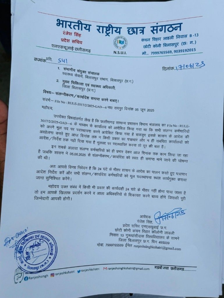 इस लापरवाही के खिलाफ एनएसयूआई ने मोर्चा खोल दिया है। संगठन ने विभाग को चेतावनी देते हुए कहा है कि यदि 24 घंटे के भीतर सभी संलग्न कर्मचारियों को उनके मूल पद पर पदस्थ करने की प्रक्रिया शुरू नहीं की गई, तो वे उग्र आंदोलन और प्रदर्शन करेंगे। इसके साथ ही उच्च अधिकारियों को लिखित शिकायत भी की जाएगी, जिसकी समस्त जिम्मेदारी स्वास्थ्य विभाग की होगी।