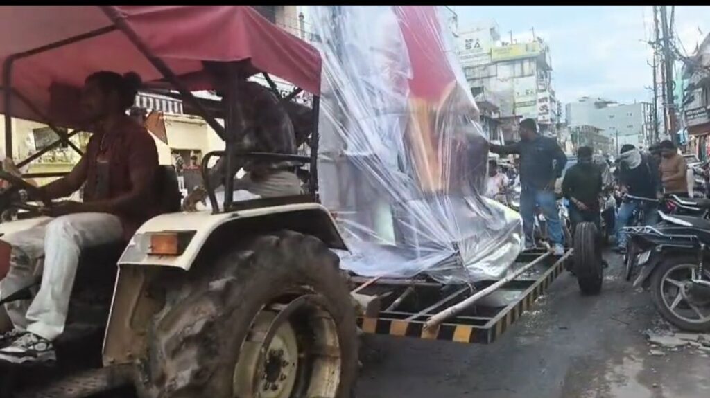 आप खुद देखिये ये तस्वीरे गांधी चौक से जूनाबिलासपुर हटरी चौक के बीच के सड़क का नजारा है, कैसे विघ्नविनाशक भगवान श्री गणेश की प्रतिमाएं गाड़ियों और ऑटो व ठेले में हिचकोले खाते आ रहे है।