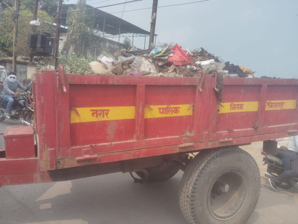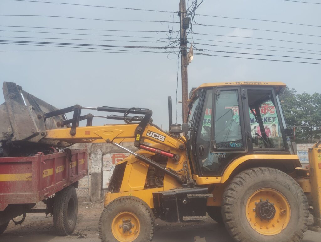0 गोड़पारा में बीच सड़क पर निगम का ट्रैक्टर और एक्सीवेटर लगवा उठवा रहे कचरा