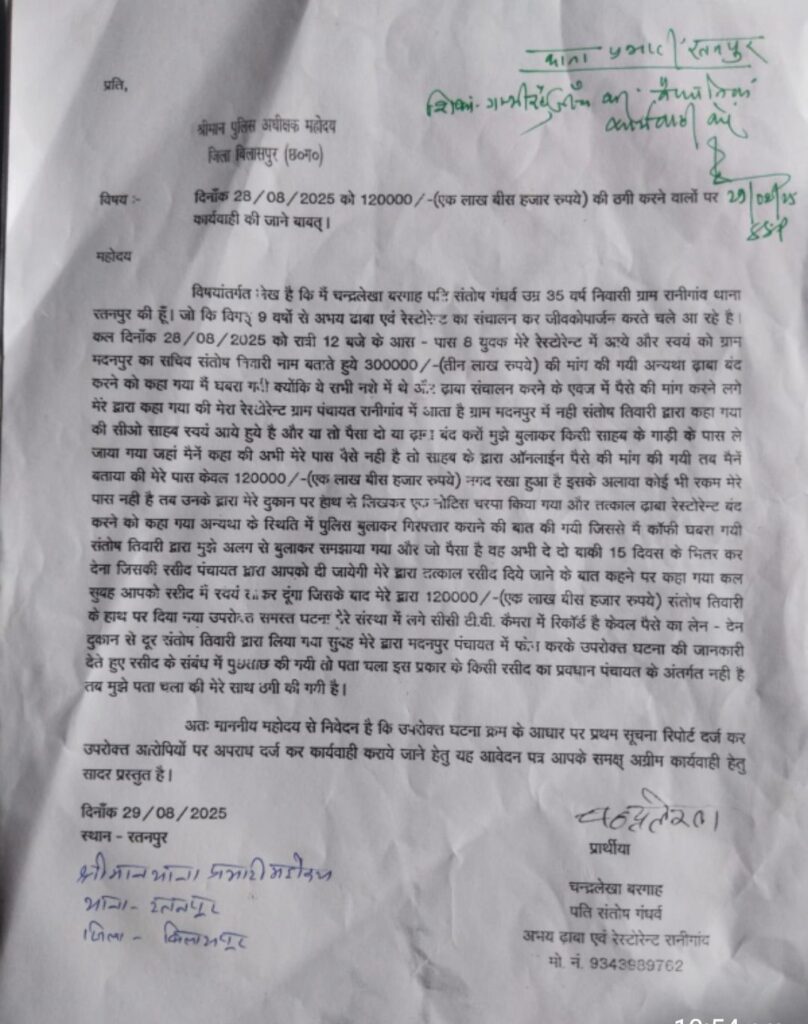 आरोप है कि पंचायत सचिव और उसके साथी शराब के नशे में थे उन्होंने पैसा न देने पर ढाबा बंद कराने धमकी देते हुए कहा कि गाड़ी में सीईओ साहब बैठे हैं उन्होंने रकम मंगवाई है… ये लोग भयादोहन कर उसे बाहर ले गए और उससे 1.20 लाख रुपये लेने के बाद रेस्टोरेंट की दीवार पर हाथ से लिखी नोटिस भी चिपका बाकी रकम 15 दिन में जमा कराने दबाव बनाया। अगले दिन जब महिला ने पंचायत से संपर्क किया तो साफ हुआ कि ऐसी कोई रसीद पंचायत से जारी ही नहीं होती। ठगी का अहसास होने पर पीड़िता ने रतनपुर थाने में भी शिकायत की, लेकिन उसकी रिपोर्ट ही नही लिखी गई।