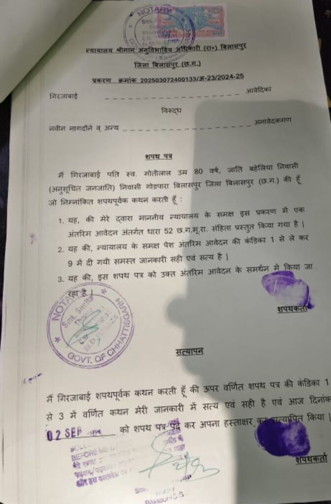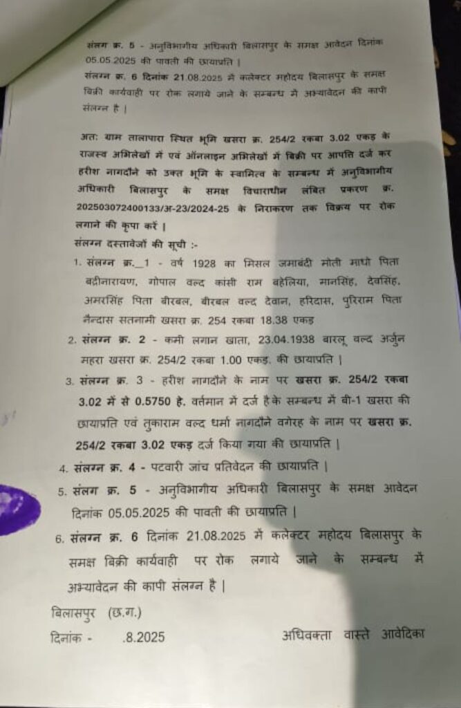 अधिवक्ता विवेक त्रिपाठी ने बताया कि खसरा नंबर 254/1 में 5 एकड़ जमीन उनके पक्षकारों के नाम तालापारा में है! जिसमें से 2 एकड़ 2 डिसमिल गिरजाबाई के नाम पर 1 एकड़ लक्ष्मी गोदानी के पूर्वज बालू वल्द अरविंद महरा और 1 एकड़ 98 डिसमिल काशीराम वल्द बहरा सतनामी की है! जो उसी के कब्जे में है! इस 5 एकड़ जमीन में से 3 एकड़ 2 डिसमिल जमीन को मगरपारा के तुकाराम नागदोने ने राजस्व रिकॉड में चढ़ावा लिया और अब वह इस भूमि को TNC काट कर बिक्री कर रहा है! अभी उसके बेटे हरीश नागदौने द्वारा फर्जी TNC काट कर बेचने का आरोप भी अधिवक्ता ने लगाया है!