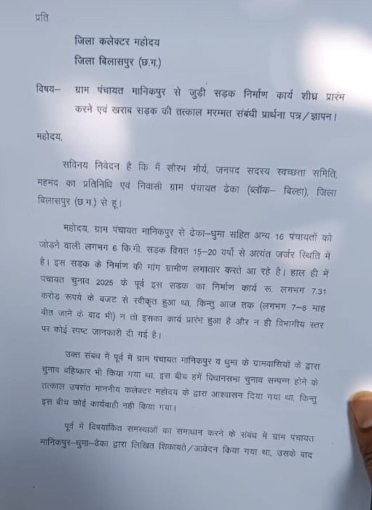 बिलासपुर। ढेंका मानिकपुर धूमा सिलपहरी समेत 15 गाँवो के ग्रामीण बदहाल गड्ढ़ेदार सडकों से हलाकान जनप्रतिनिधियों और ग्रामीणों ने बुधवार को फिर कलेक्ट्रेट में प्रदर्शन कर कलेक्टर के नाम सड़क की मरम्मत कराने ज्ञापन सौंपा। करीब 6 किलोमीटर लंबी सड़क के लिए ये ग्रामीण 18 साल से संघर्ष कर रहे कई बार आवेदन दे चुके कीचड़ से सराबोर सड़क पर धा का थरहा लगा प्रदर्शन किया, पिछले विधानसभा चुनाव का बहिष्कार किया एक भी वोटिंग नही हुई, तब से आज तक केवल आश्वासन ही मिलते आ रहा।