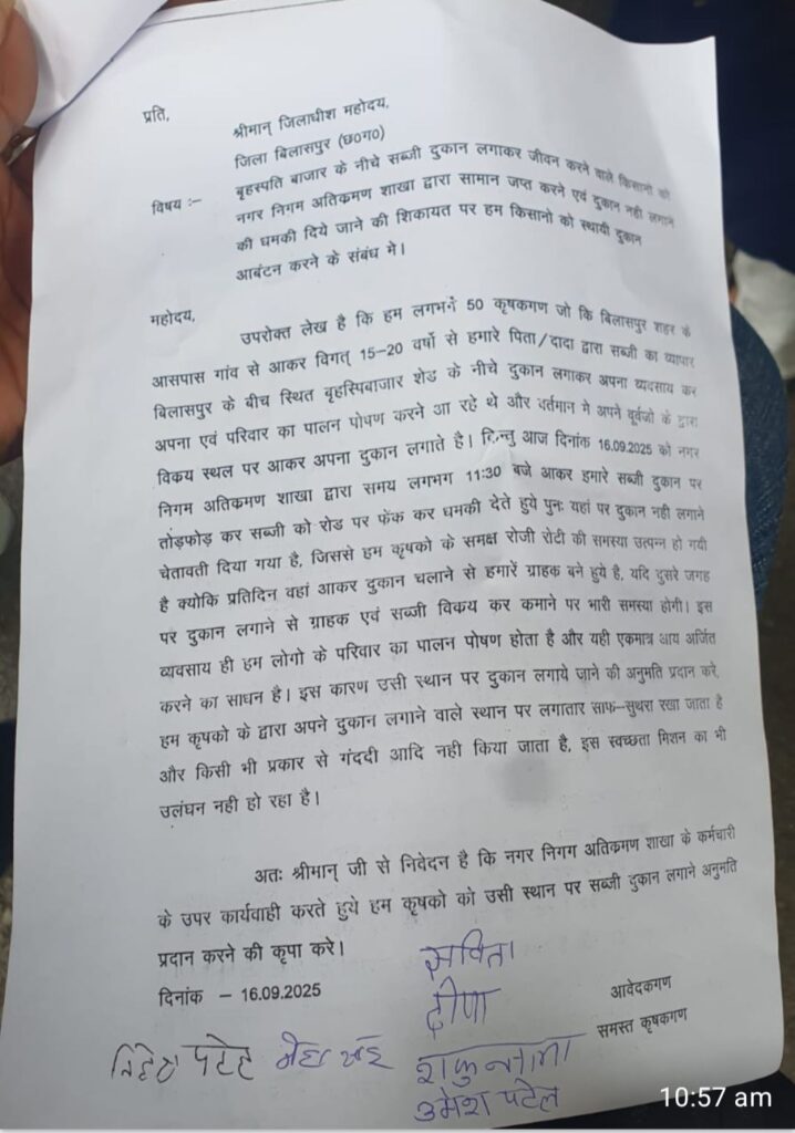 बिलासपुर। नगर निगम के बस वाले अतिक्रमण दस्ते पर शराब पीकर महिला सब्जी विक्रेताओं से छीना झपटी और मनमाने उगाही का आरोप लगा है। बृहस्पति बाज़ार के कृषक सब्जी विक्रेताओं ने कलेक्टर से गुहार लगा ऐसे कर्मचारियों के खिलाफ कार्रवाई और रोजी- रोजगार के लिए जगह मुहैया कराने मांग की गई है।