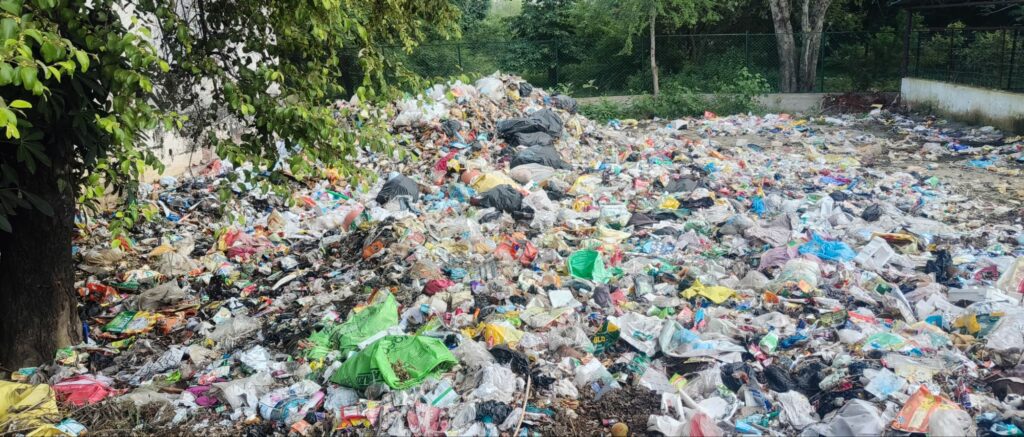 गोठान के पीछे एक शेड को एसएलआरएम सेंटर यानि कचराखाना बना दिया गया है, पॉलीथिन का कचरा और सड़ांध मारती गन्दगी का ढेर से किनारे सामने से पीछे तक बिखरा है और पीछे तो कचरे का पहाड़ खड़ा कर दिया गया है।