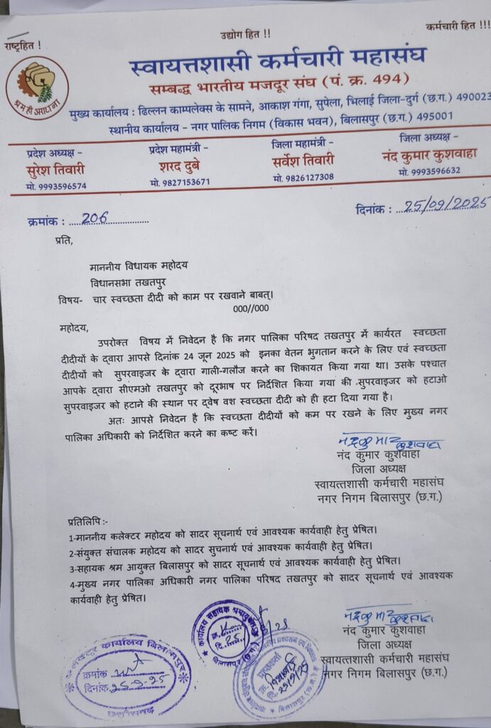 बिलासपुर,,,, तखतपुर मुख्य नगर पालिका अधिकारी द्वारा 4 स्वक्षता दीदियों को काम से हटाने के विरोध में स्वायतशासी कर्मचारी महासंघ ने मोर्चा खोल दिया है! संघ ने तखतपुर विधायक, कलेक्टर मुख्य नगर पालिका अधिकारी, तखतपुर और श्रम आयुक्त, जेडी को पत्र भेजकर चारो दीदियों को काम पर वापस लेने और वेतन भुगतान करने की मांग की है!