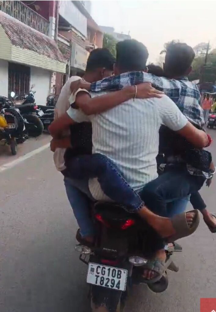 यह वायरल वीडियो अरपापार मुक्तिधाम रोड से सीपत चौक के बीच की बताई जा रही है। इस वायरल वीडियो में आप खुद देखिये कैसे 5 नवाबजादे न केवल कानून का खुला उल्लंघन रहे बल्कि सड़क पर चल रहे अन्य राहगीरों की जान को भी जोखिम में डालकर यातायात पुलिस को खुली चुनौती दे रहे कि कर लो जो करना है…? ज्यादा से ज्यादा करेंगे क्या चालानी कार्रवाई न करेंगे।