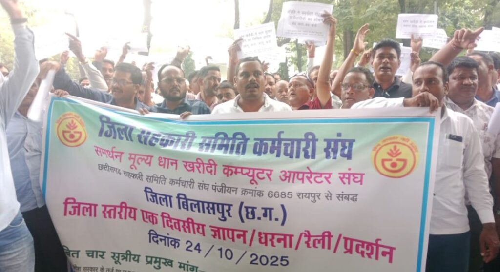 बिलासपुर। छत्तीसगढ़ सहकारी समिति कर्मचारी संघ और समर्थन मूल्य धान खरीदी ऑपरेटर संघ ने ऐन खरीदी शुरू होने से पहले अपनी चार सूत्रीय मांगों को लेकर आंदोलन का ऐलान कर सरकार की मुसीबत खड़ी कर दी है। शुक्रवार को दोनों संगठनों ने कलेक्टर के नाम अतिरिक्त कलेक्टर शिव कुमार बेनर्जी को ज्ञापन सौंप मांगे पूरी न होने पर आगामी धान खरीदी के बहिष्कार का ऐलान किया है।इन आंदोलनरत कर्मचारियों का कहना है कि वे लोग पहले भी आंदोलन कर शासन-प्रशासन को अपनी मांगों से अवगत करा चुके है लेकिन उनकी मांगे अब तक पूरी नहीं की गईं।